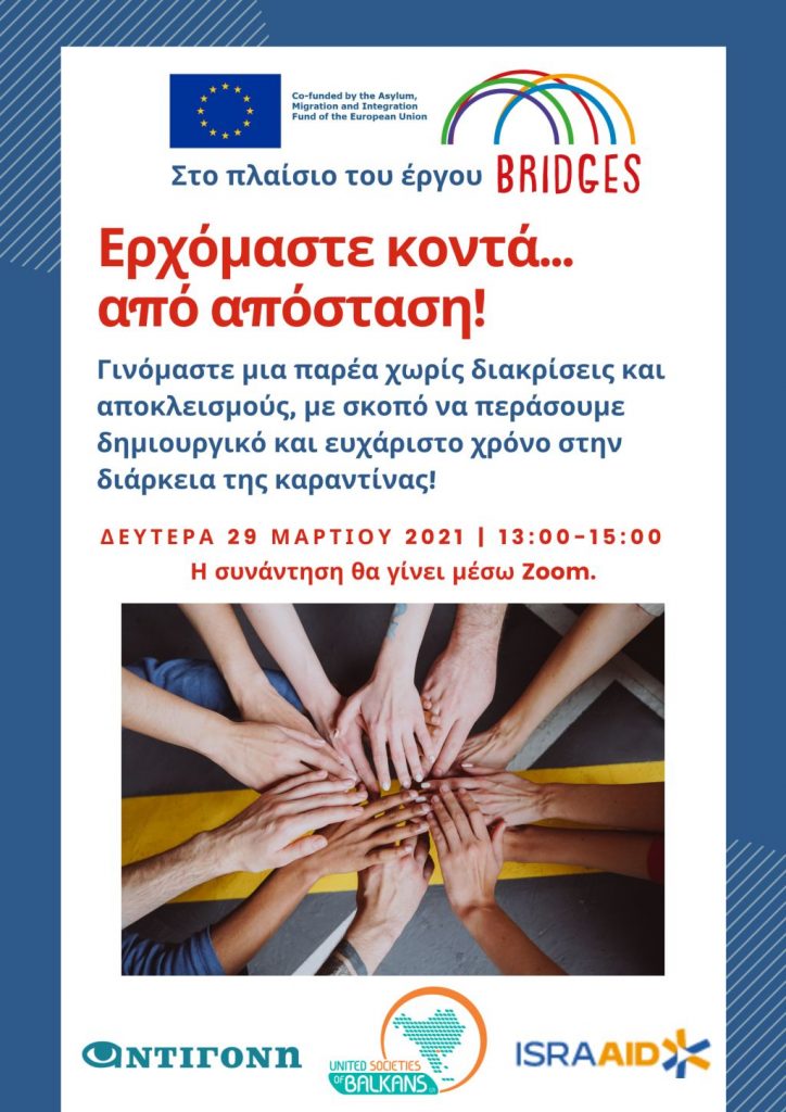 Πρόκειται για την 1η διαδικτυακή συνάντηση “Ερχόμαστε κοντά… από απόσταση!” η οποία θα γίνει τη Δευτέρα 29 Μαρτίου, 13:00-15:00 , στο πλαίσιο του έργου BRIDGES.